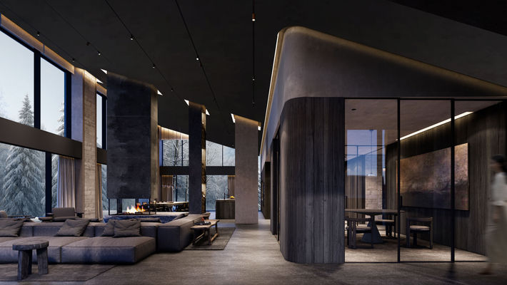 Dark, muted tones and soft, curved forms create a calm and intimate retreat, in dialogue with the snowy landscape.