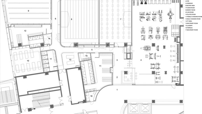The four classrooms, named “Energy Room,” “Fusion Room,” “Flow Room,” and “Pilates Room,” are differentiated through distinct materials, colors, and lighting.
